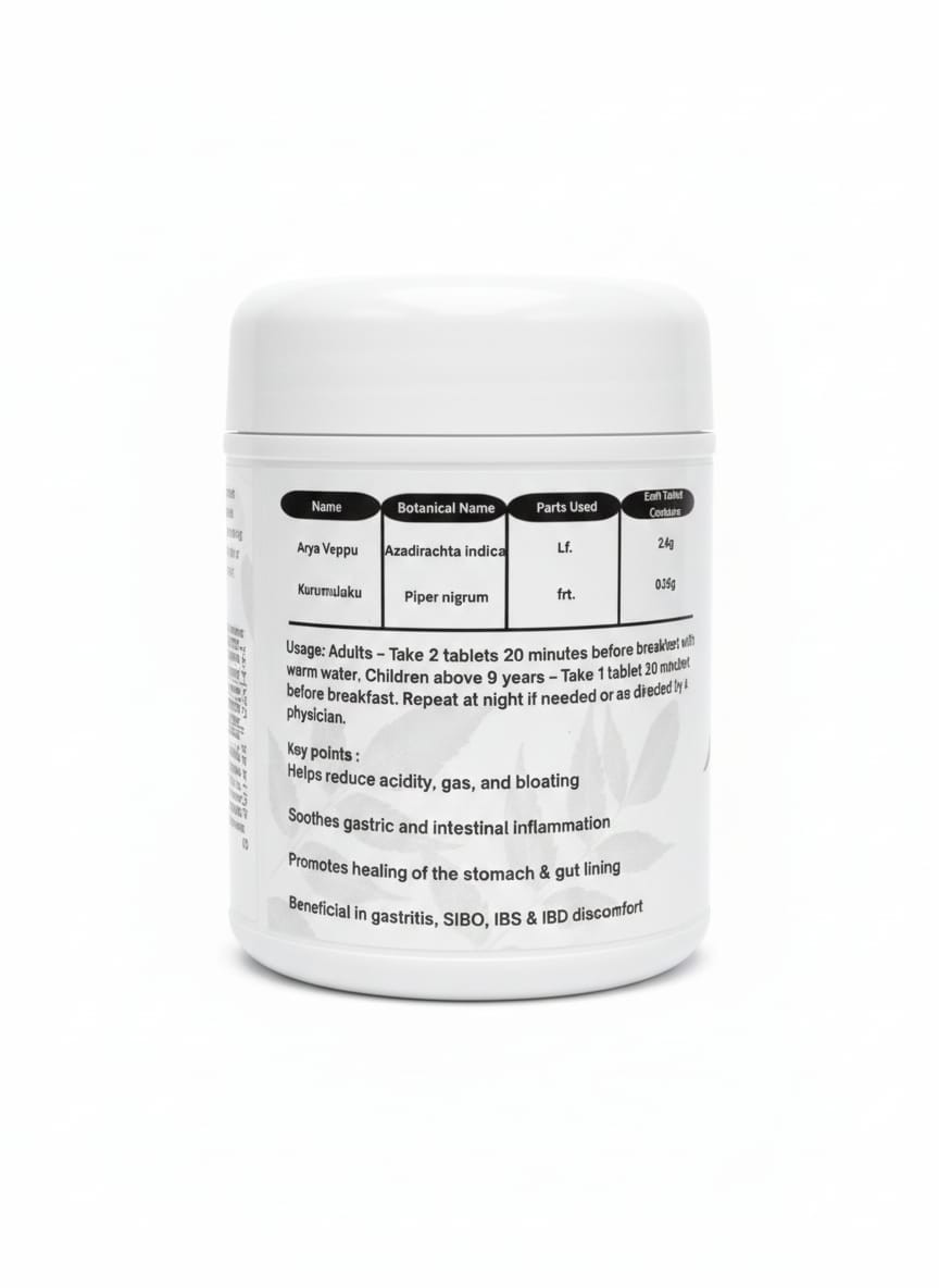 A soothing Ayurvedic blend of Neem and Black Pepper that supports healthy digestion and gut balance. Helps reduce acidity, bloating, and inflammation while promoting healing of the stomach and intestinal lining. Beneficial for overall gut wellness, including gastritis, SIBO, IBS, and IBD-related discomfort.