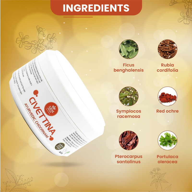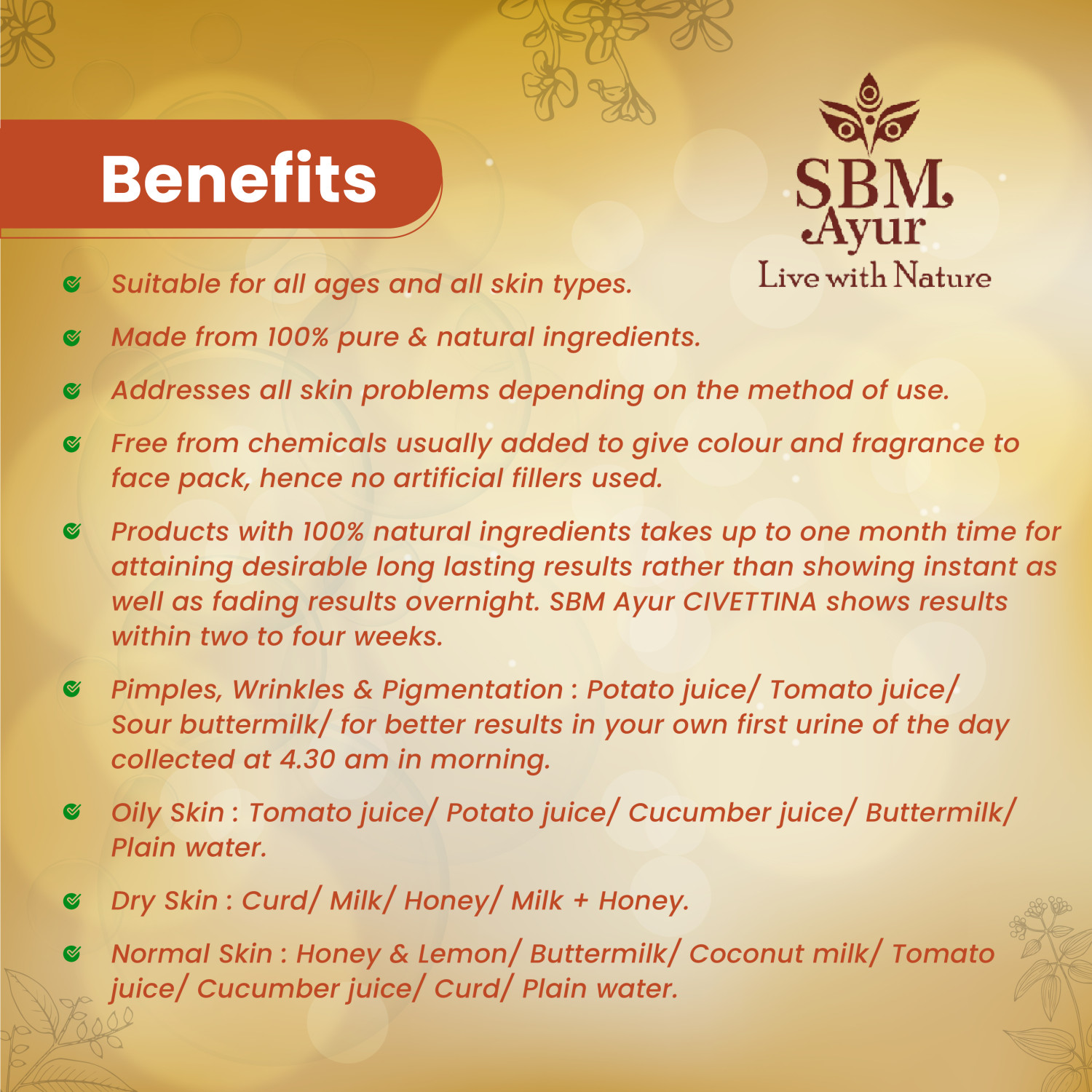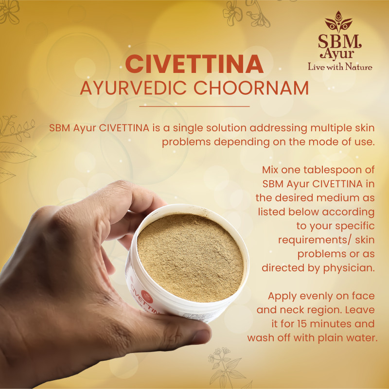 USAGE : SBM Ayur CIVETTINA is a single solution addressing multiple skin problems depending on the mode of