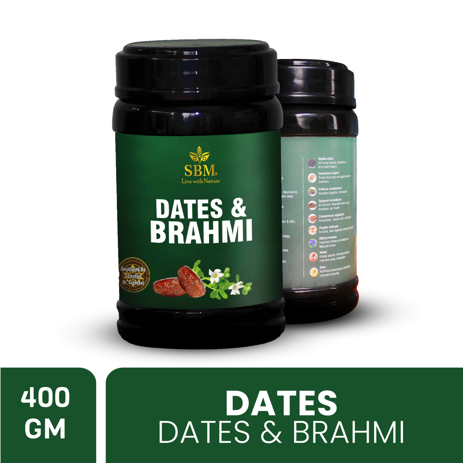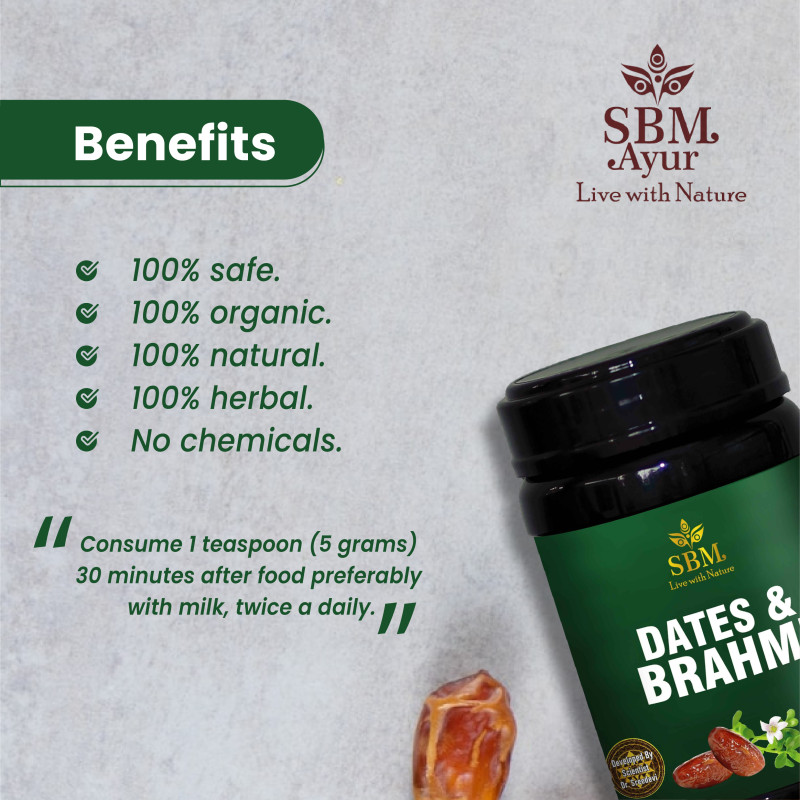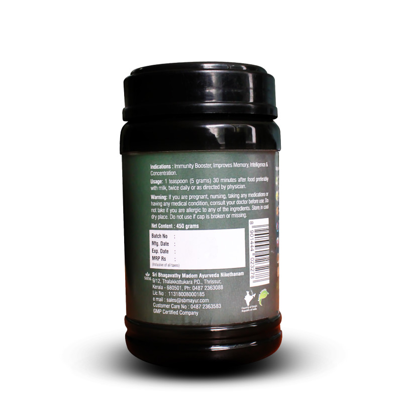 INGREDIENTS : Bacopa monnieri, Emblica officinalis, Withania somnifera, Cynodon dactylon, Clitoria ternatea, Phoenix dactylifera, Linum usitatissimum, Cuminum cyminum, Nigella sativa, Foeniculum vulgare, Elettaria cardamomum, Syzygium aromaticum, Cinnamomum zeylanicum, Zingiber officinale, Saccharum officinarum, Honey, Ghee.