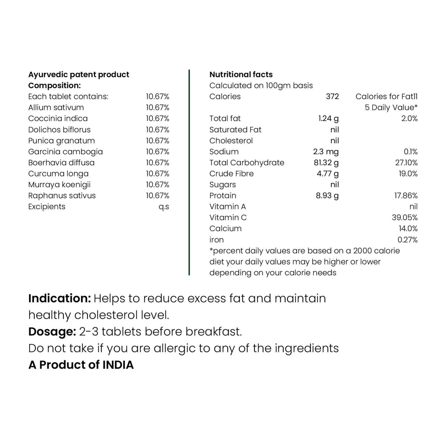 INGREDIENTS : Allium sativum, Coccinia indica, Dolichos biflora, Punica granatum, Garcinia indica, Boerhavia diffusa, Curcuma longa, Murraya koenigii, Raphanus sativus.