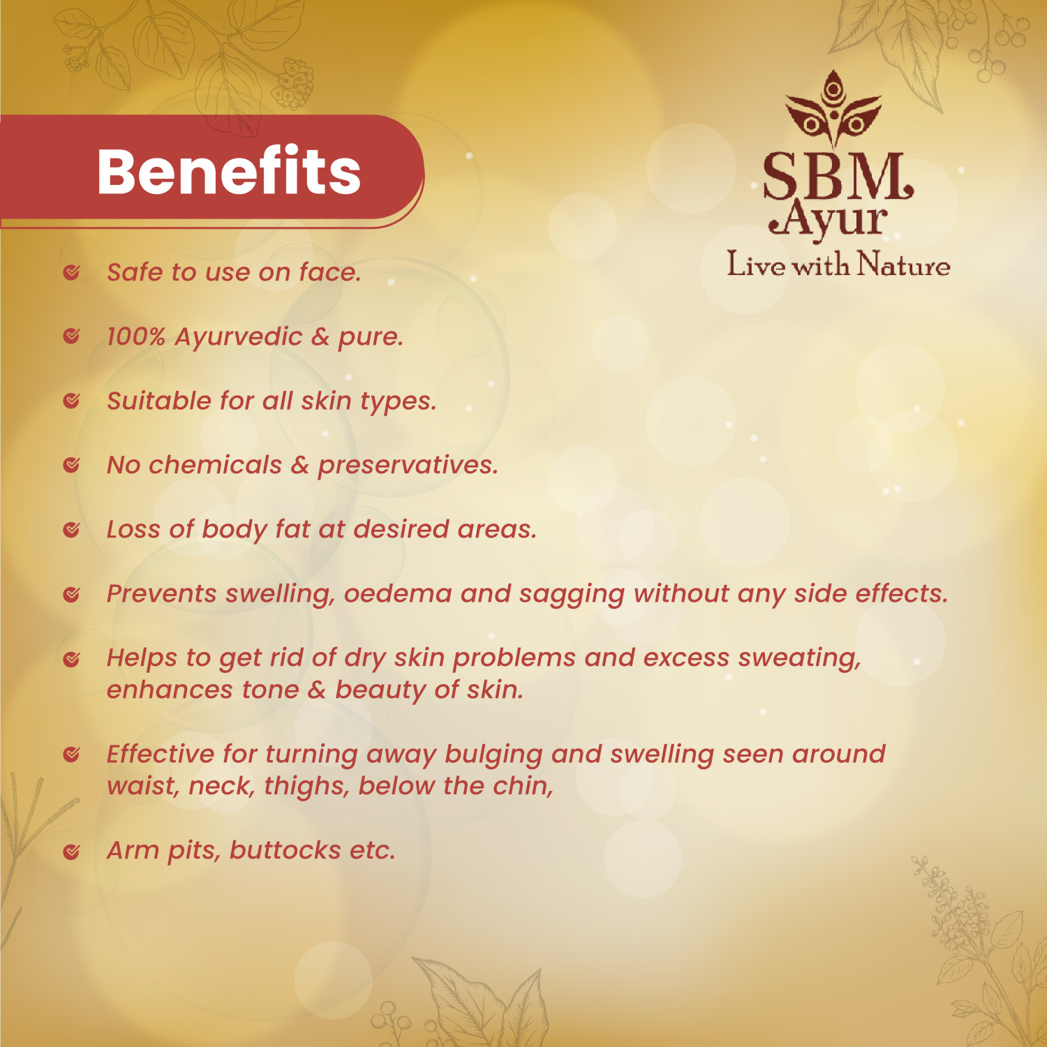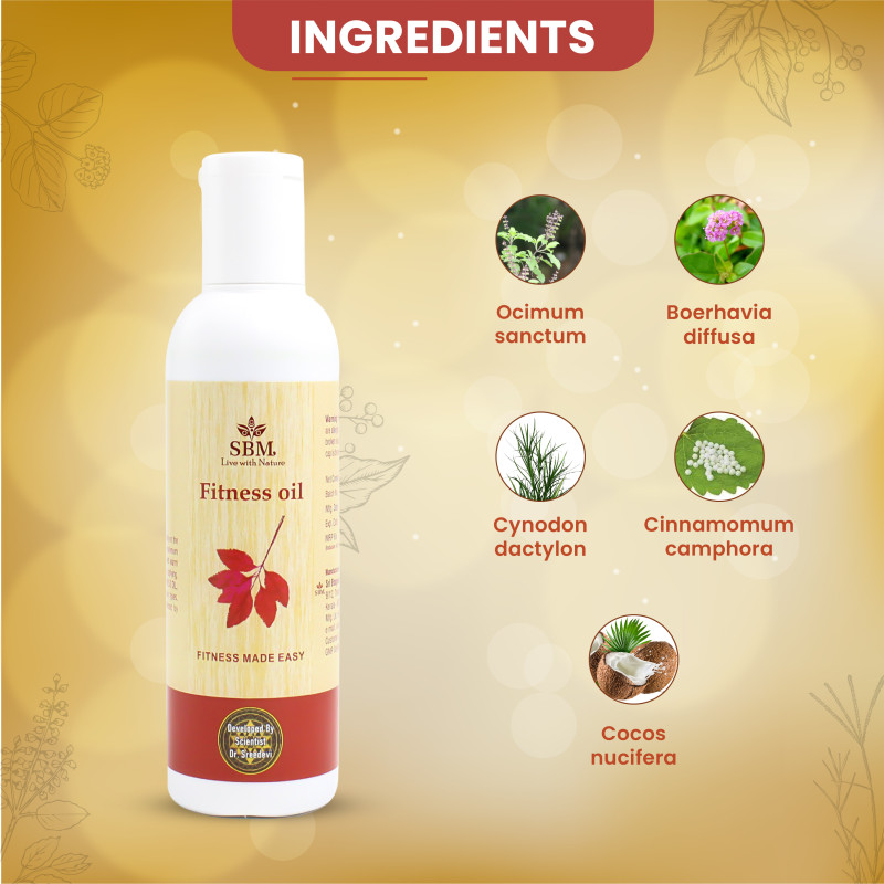 USAGE : Apply SBM Ayur FITNESS OIL generously on the required area and massage upwards for minimum 5 - 10 minutes. Wash off after one hour with warm water. For better results heat oil before applying. Drink plenty of water while using SBM Ayur FITNESS OIL. Continue usage for 3 months or as directed by physician. Daily usage is recommended.