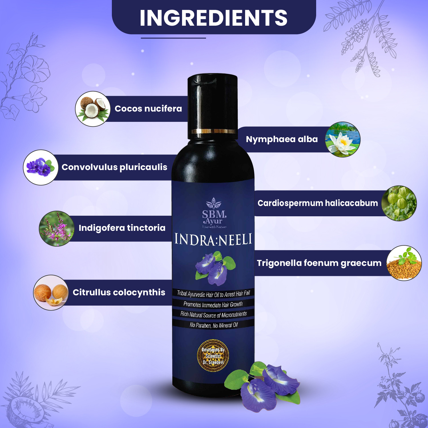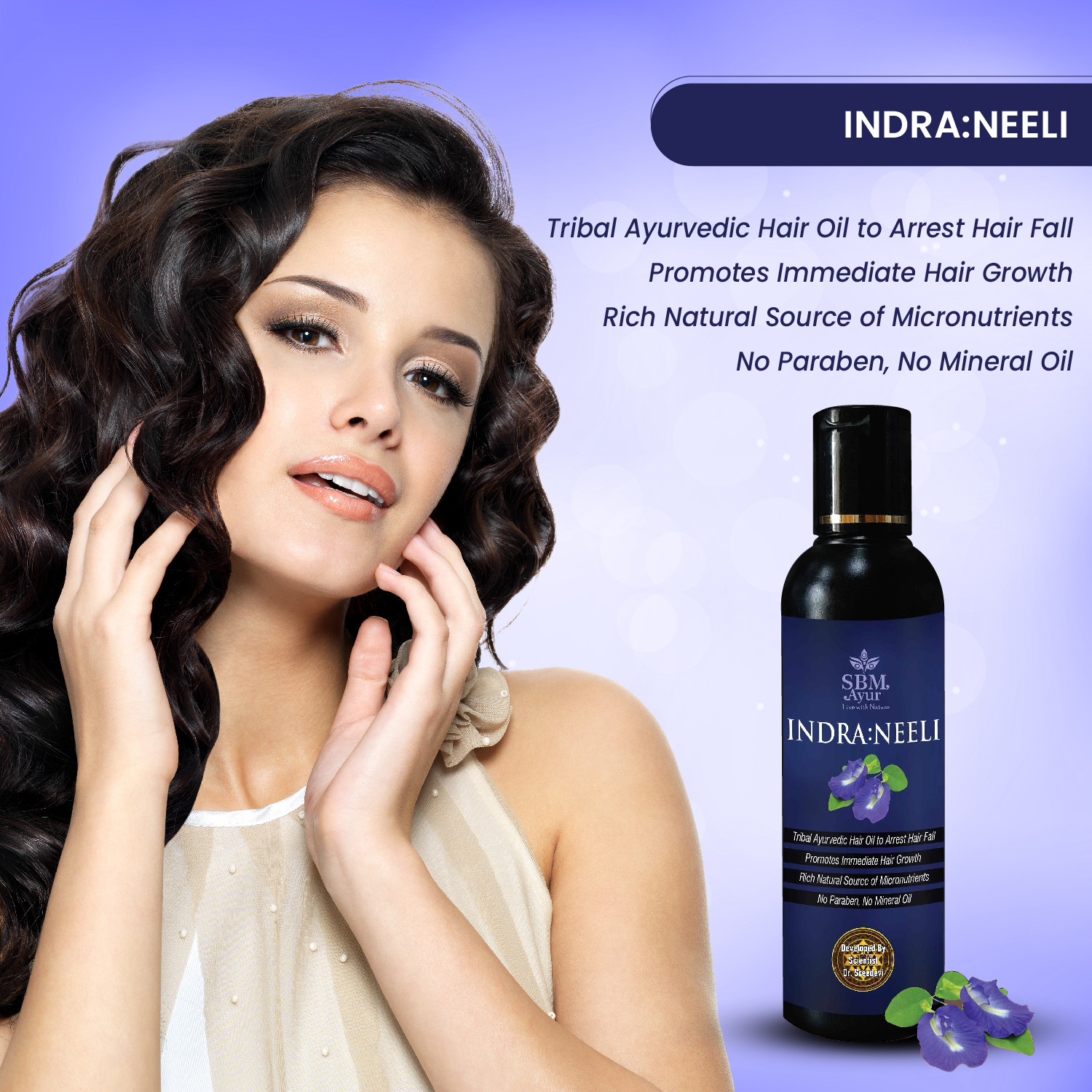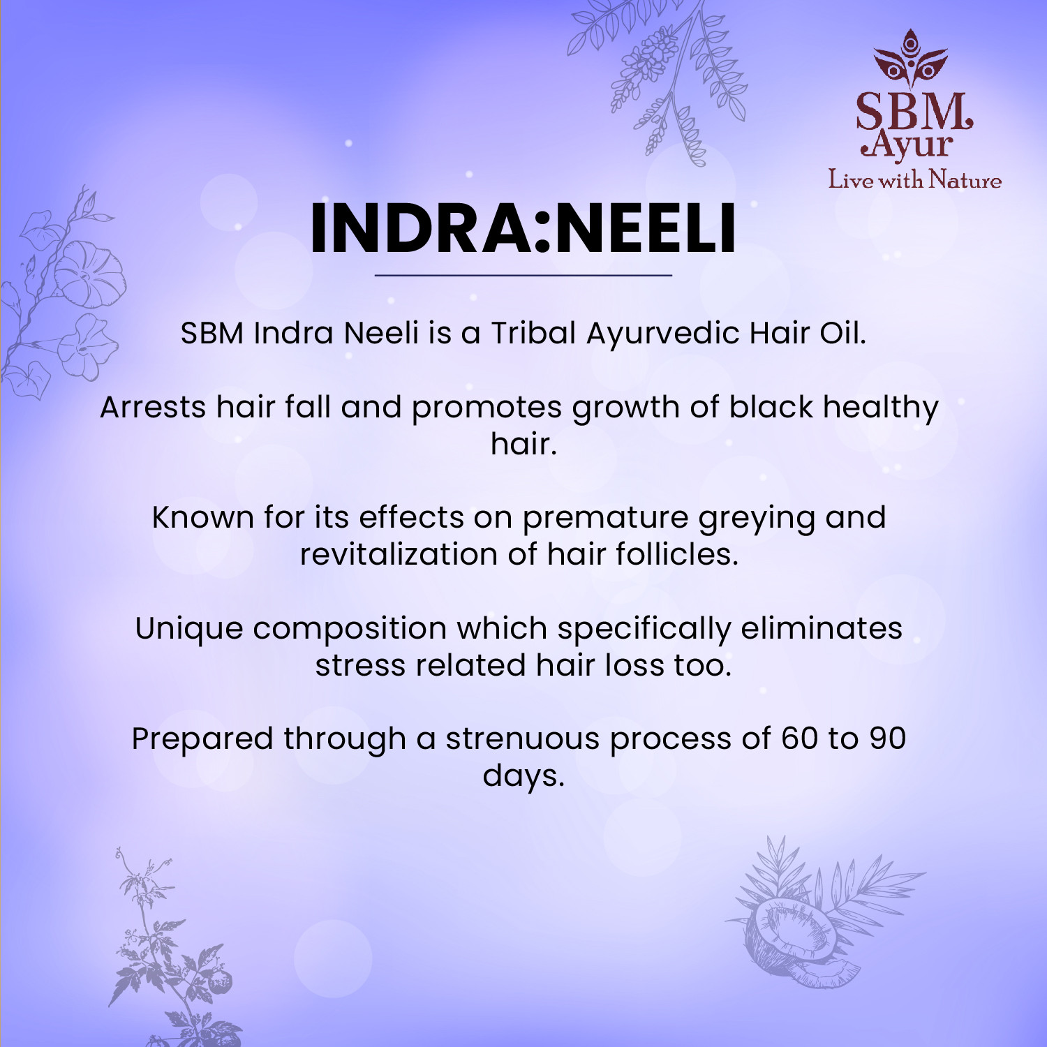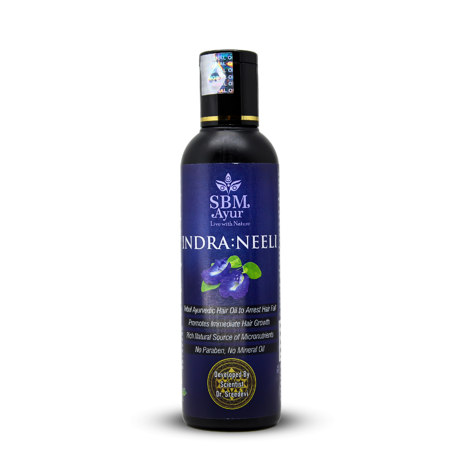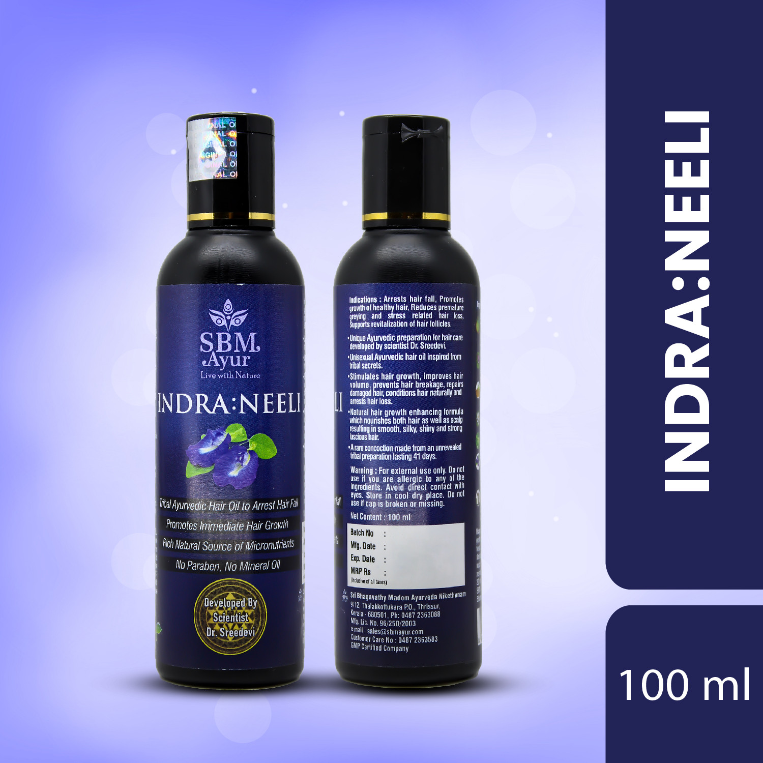 USAGE : Massage SBM Ayur INDRA:NEELI gently on scalp, apply on pate (centre of head), behind