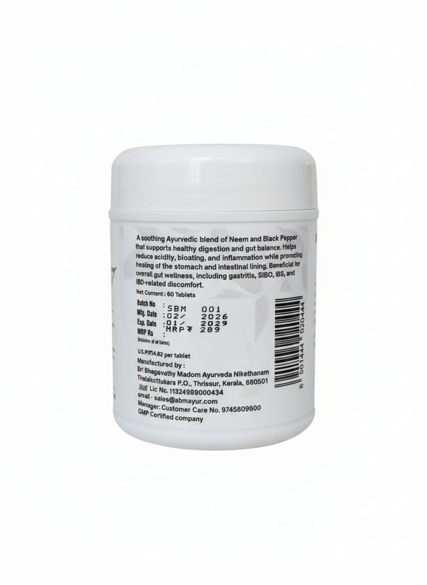 A soothing Ayurvedic blend of Neem and Black Pepper that supports healthy digestion and gut balance. Helps reduce acidity, bloating, and inflammation while promoting healing of the stomach and intestinal lining. Beneficial for overall gut wellness, including gastritis, SIBO, IBS, and IBD-related discomfort.
