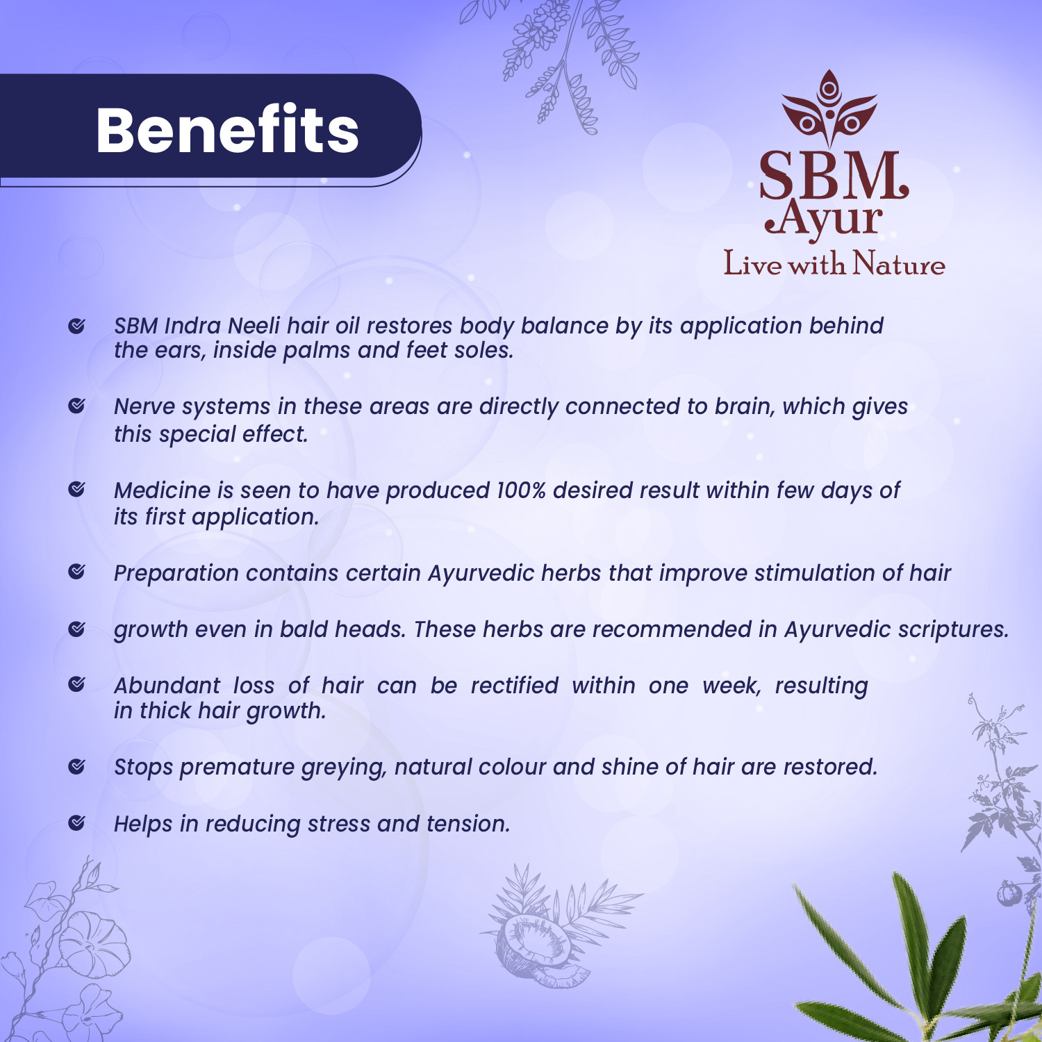 energise nerves of head as well as body. After 15- 20 minutes of application, wash hair with SBM Ayur THIRUTHAALI- Pure Leaf Juice Shampoo.